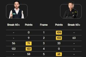 肖国栋打出一杆破百(122)和两杆50+(56、56),周跃龙在第二局打出单杆63分。